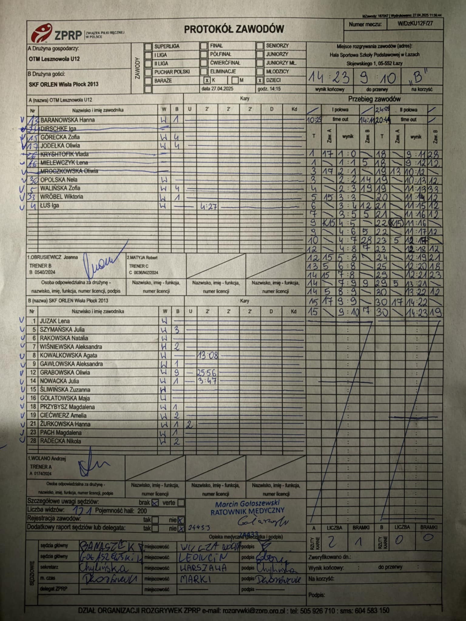 | 27 | 2025-04-27 14:15:00 | OTM Lesznowola U12 | SKF ORLEN Wisła Płock 2013 | Sędziowie: BANASZEK Piotr — — Delegat: |