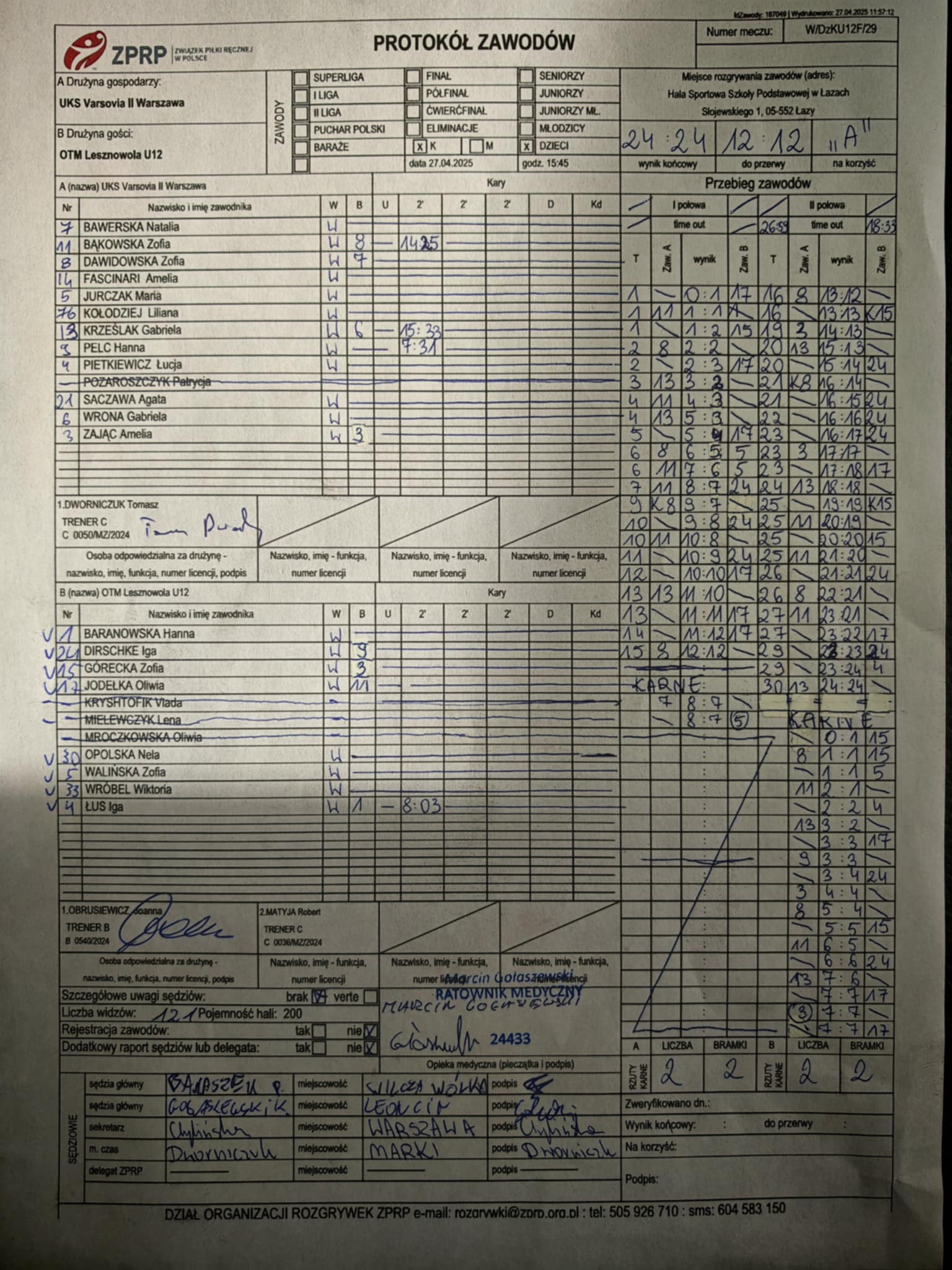 | 1 | 2025-01-26 09:30:00 | OTM Lesznowola U12 | UKS Varsovia II Warszawa | Sędziowie: CZAPLICKI Marek — — Delegat: |