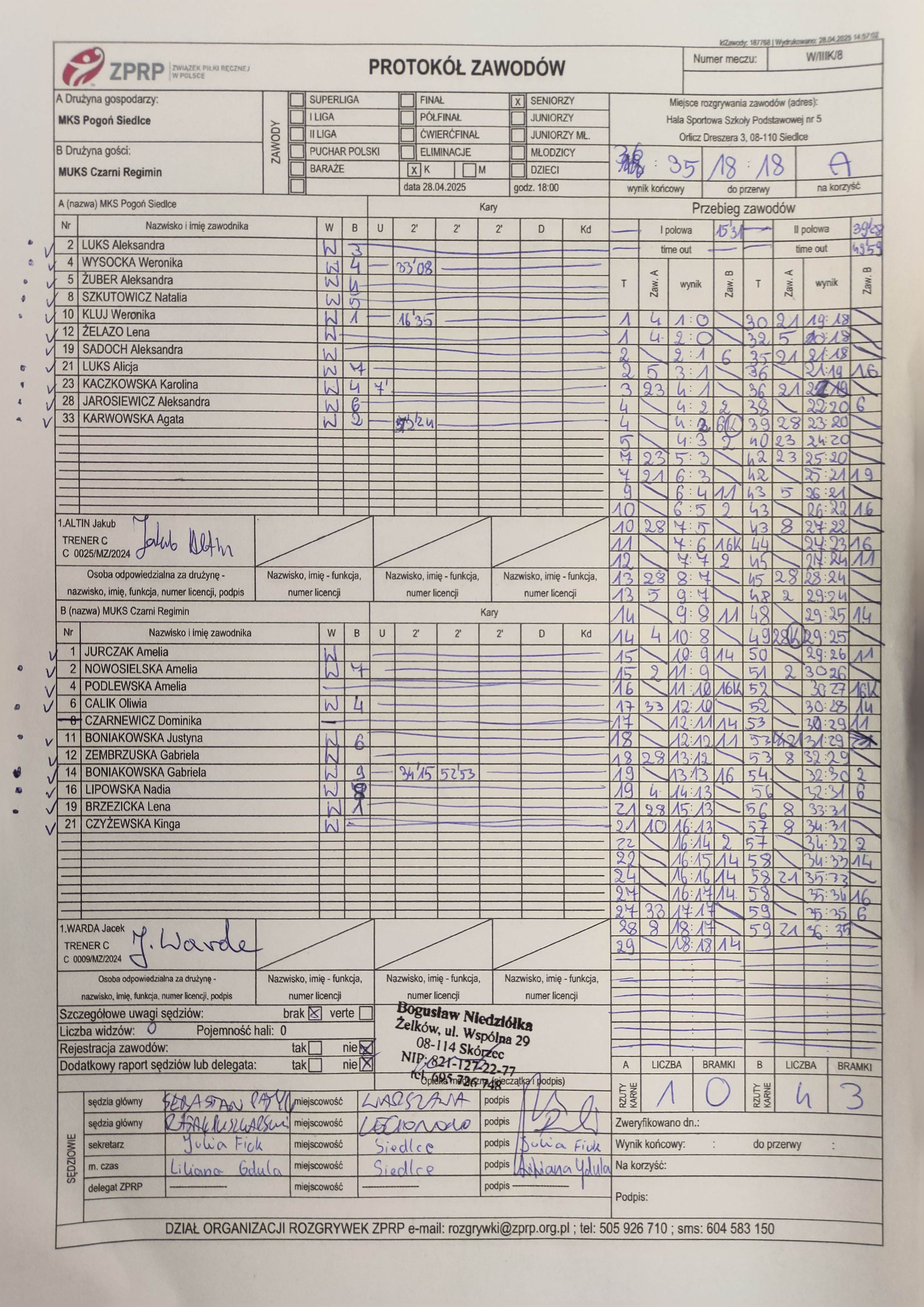 MUKS Czarni Regimin | Sędziowie: — — — — Delegat: |