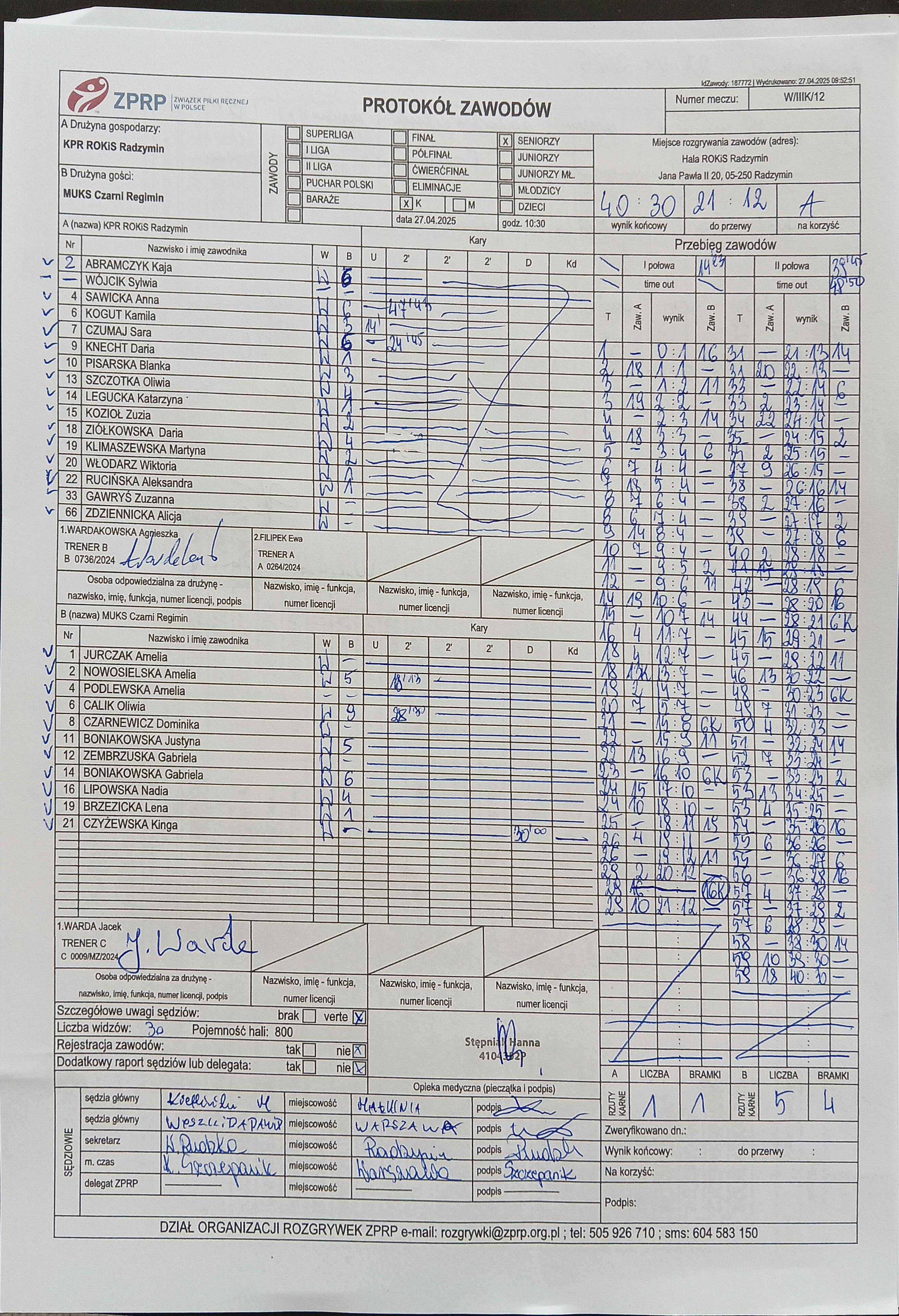 | 12 | 2025-04-27 10:30:00 | KPR ROKiS Radzymin | MUKS Czarni Regimin | Sędziowie: KIETLIŃSKI Michał — — Delegat: |