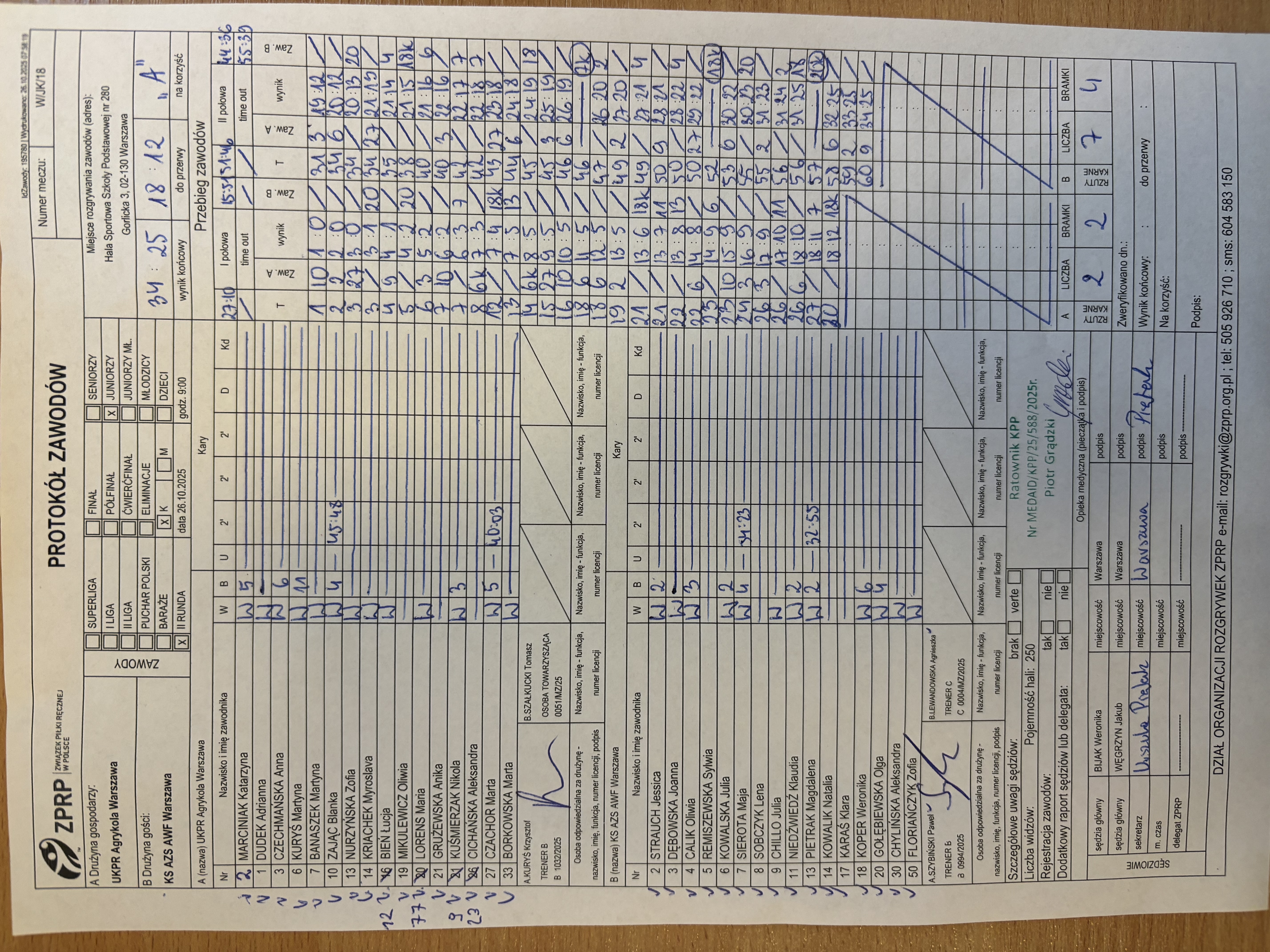 | 18 | 2025-10-26 09:00:00 | UKPR Agrykola Warszawa | KS AZS AWF Warszawa | Sędziowie: BIJAK Weronika WĘGRZYN Jakub Delegat: |