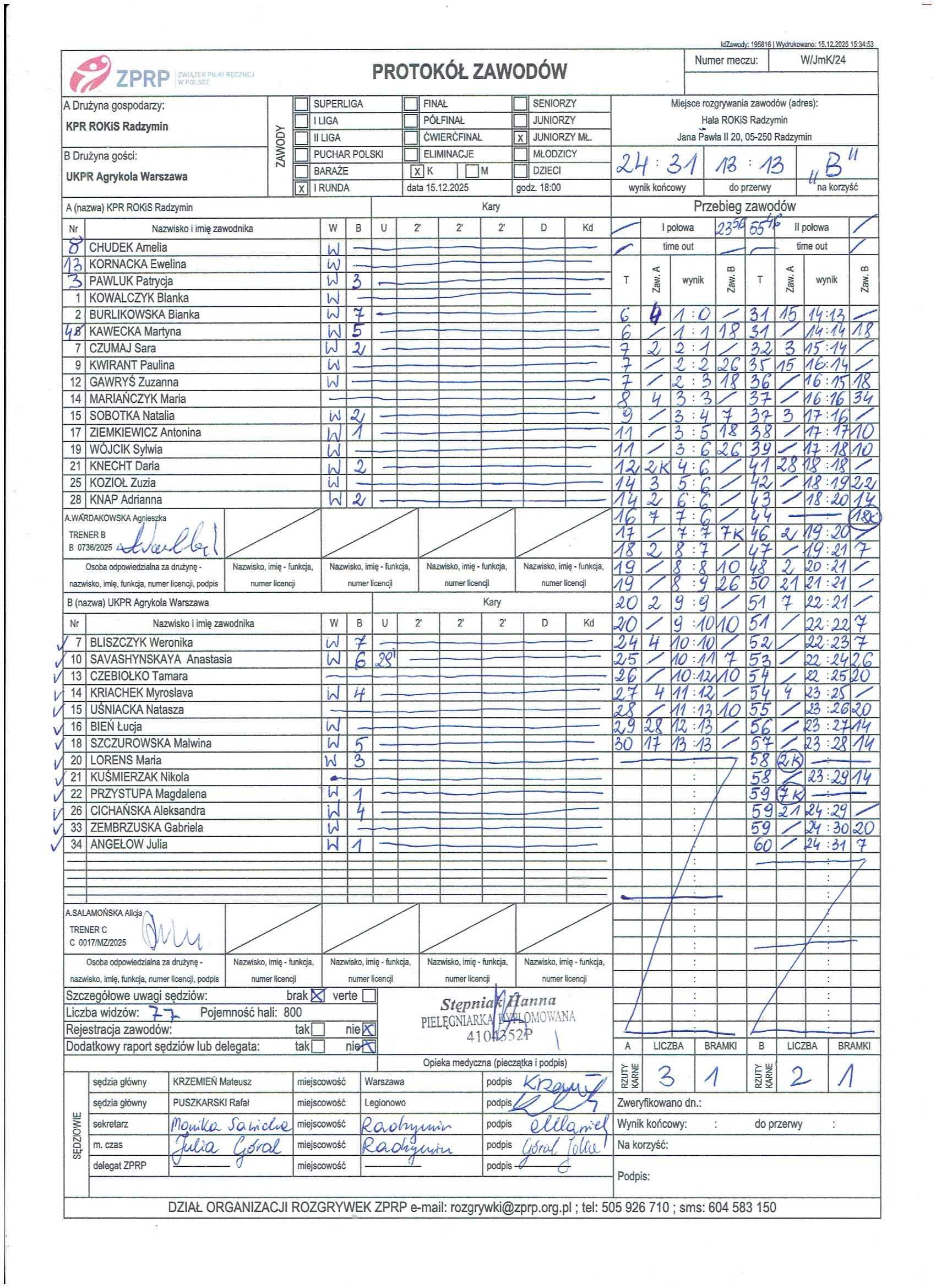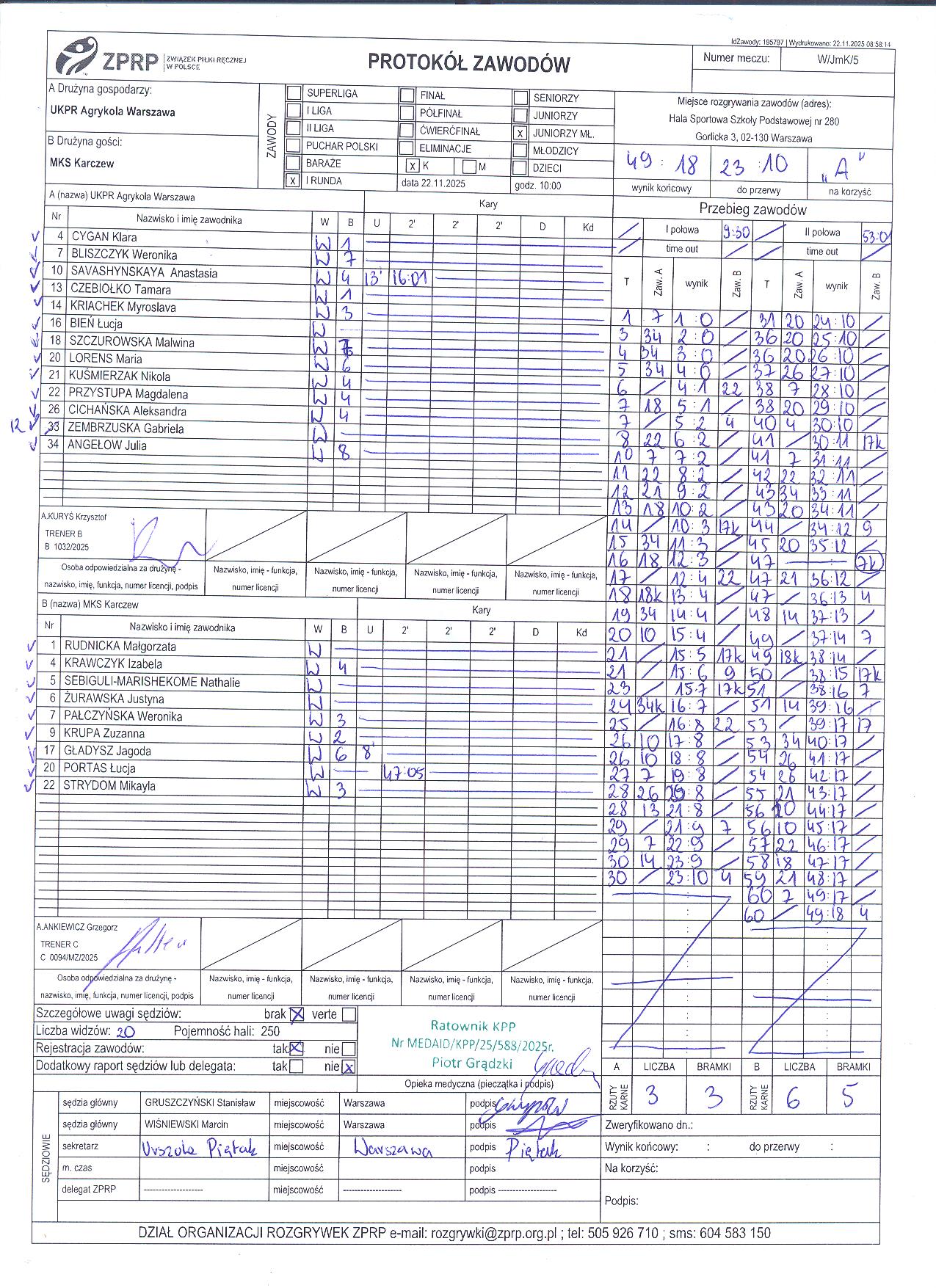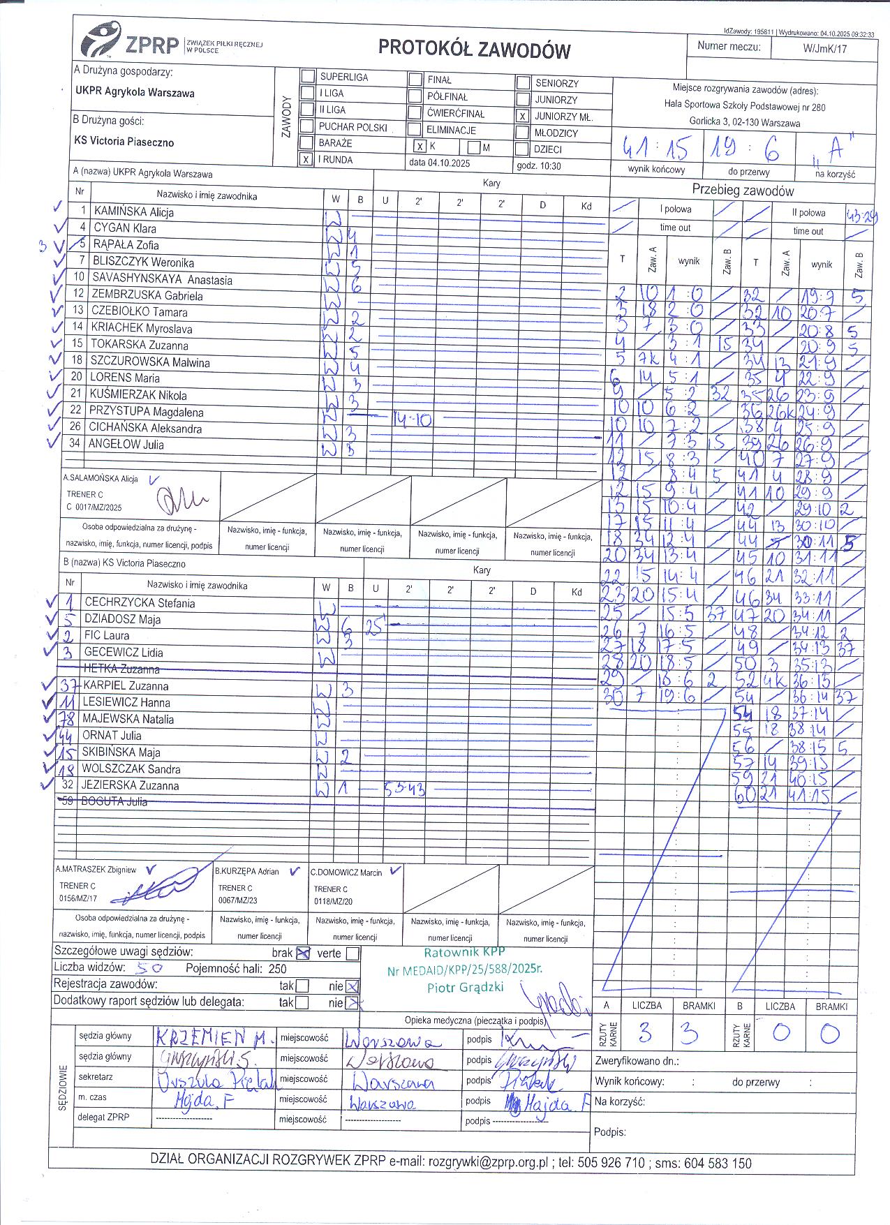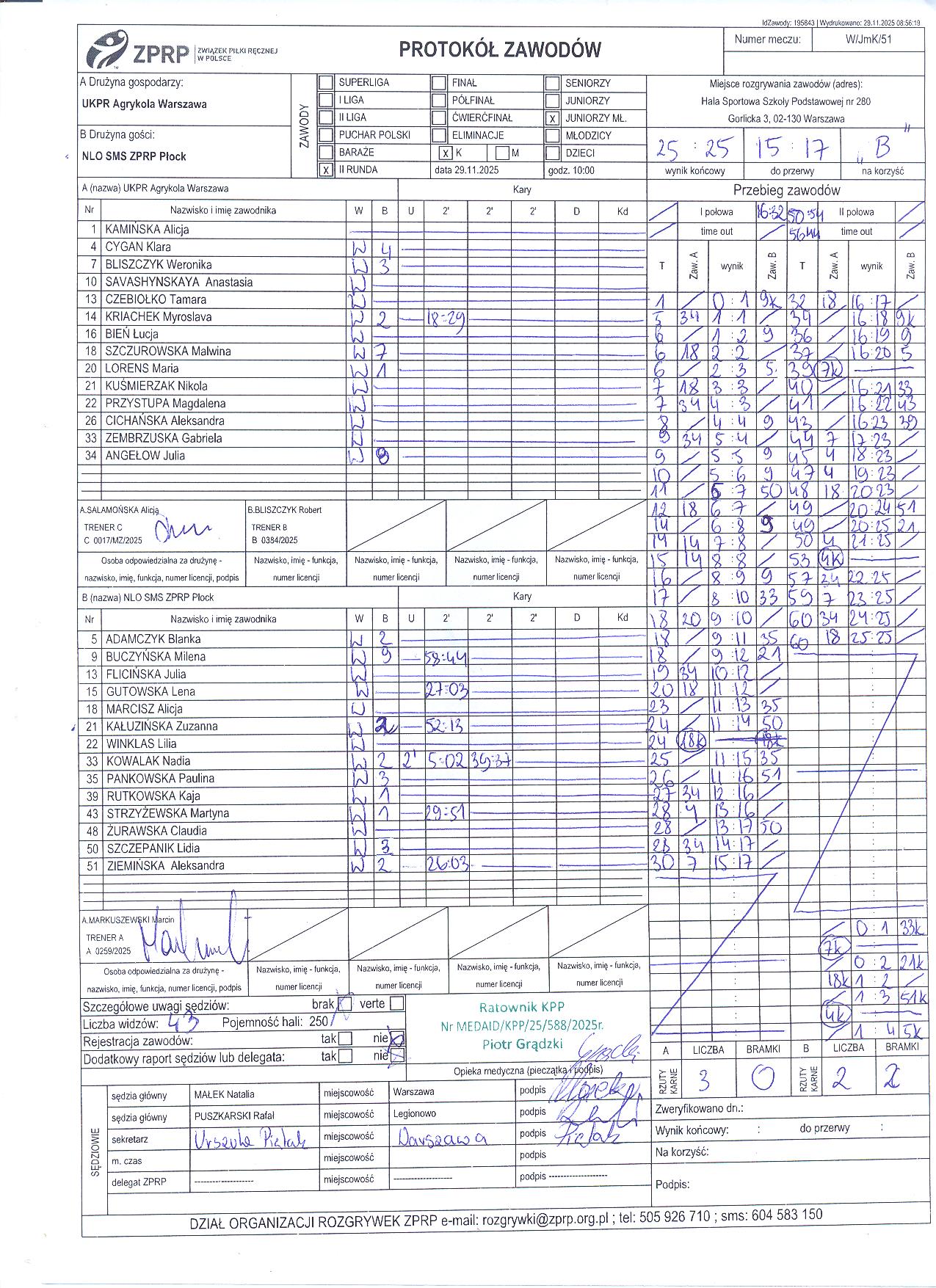 UKPR Agrykola Warszawa | Sędziowie: KRZEMIEŃ Mateusz PUSZKARSKI Rafał Delegat: |