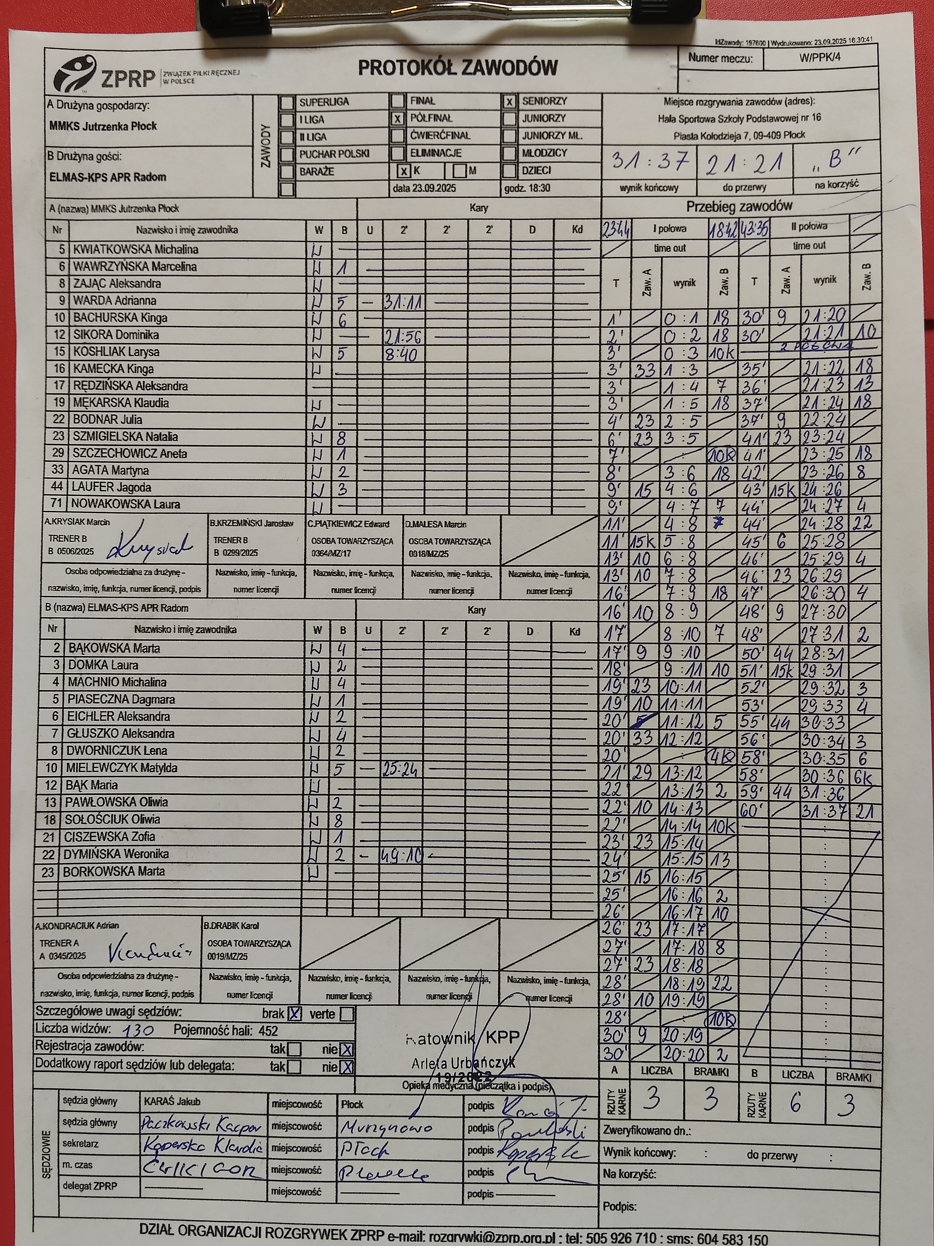 | 4 | 2025-09-23 18:30:00 | MMKS Jutrzenka Płock | ELMAS-KPS APR Radom | Sędziowie: KARAŚ Jakub Delegat: |